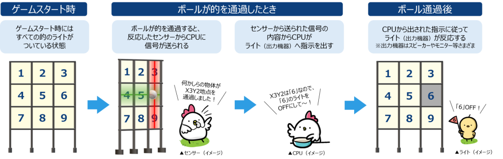 センサーで取得した情報をCPUで処理し、結果に応じてランプの点灯・点滅や、効果音・音声案内の演出を実現しました。