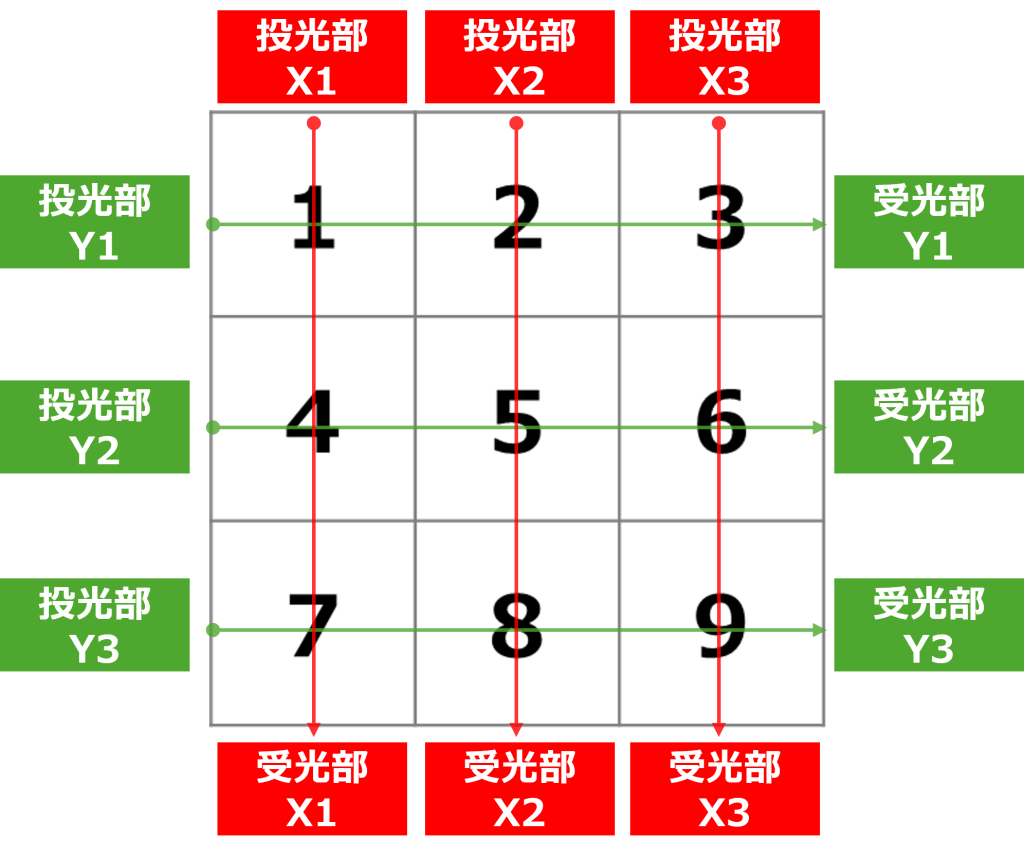 光を発射する投光部と、光を認識する受光部で 成り立っている「光電センサー」を、ストライクアウトの的に採用しました。光電センサーは光で物体を認識するため、どのセンサーが反応したかで、ボールがどの位置(どの的)を通過したかを非接触・高速で検知します。