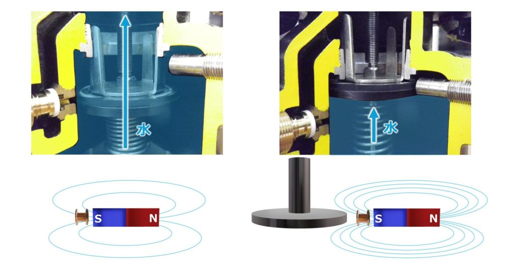 水道バルブは鉄製部品や配管など金属に囲まれた環境で使用されるため、センサーには外乱の影響を受けにくい方式が求められました。本事例では、バルブの開閉に伴って変化する磁力線の密度変化に着目し、非接触で検知可能な磁気センサー方式を採用。周囲金属の影響を考慮した磁気設計により、誤作動を抑えた安定した開閉検知を実現しています。